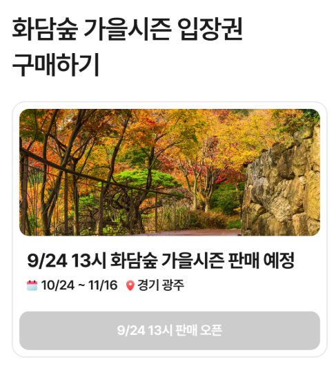 ⚠️ 주의사항: 예약 시 화담숲의 영업시간 및 입장료(모노레일 등 별도 요금 포함)를 확인하십시오. 계절별로 변동될 수 있습니다. 특히, 단풍 시즌에는 입장료가 성수기 요금으로 적용될 수 있습니다.